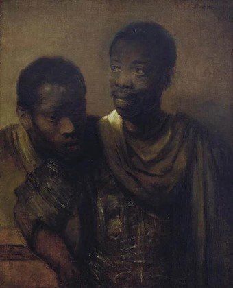 Zwarte mensen in Amsterdam. Links: Rembrandt, Afrikaanse mannen, Mauritshuis, 1661. Midden: J. van der Ulft, Markt op de Dam (detail). Stadsarchief, 1653. Rechts: Jacob van Loo, Allegorie op de spijsuitdeling aan de armen (detail), Amsterdam Museum, 1657.