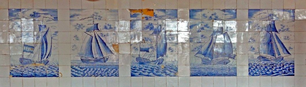 Adam Sijbel, Deel van de tegelwand met 12 schepentableaus in Hotel-Café-Restaurant 'De Prins' in Makkum. Rijksmonument.